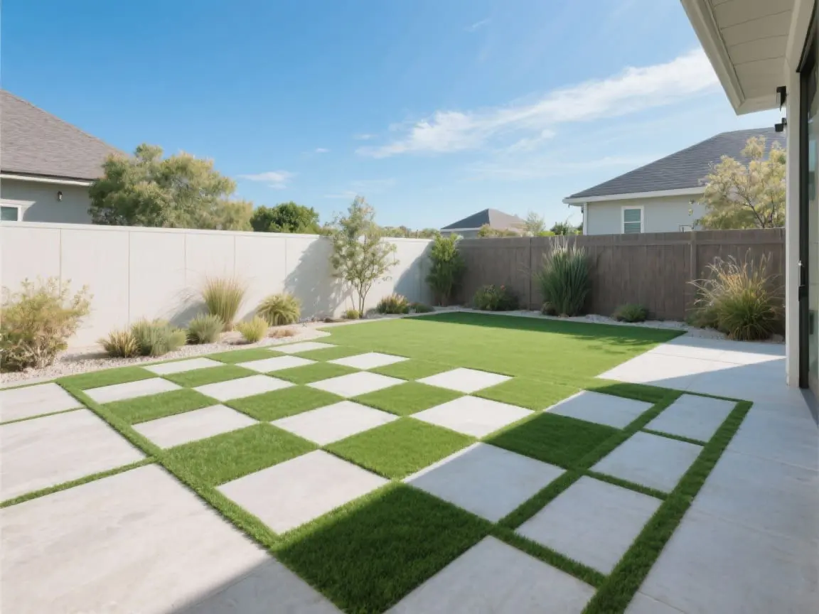 This is a highly popular, contemporary design featuring large square or rectangular pavers set with wide, clean lines of synthetic turf in between. It creates a striking checkerboard effect that makes patios and walkways feel larger and more intentional. It’s the perfect way to transform a boring concrete slab into a high-end architectural feature.