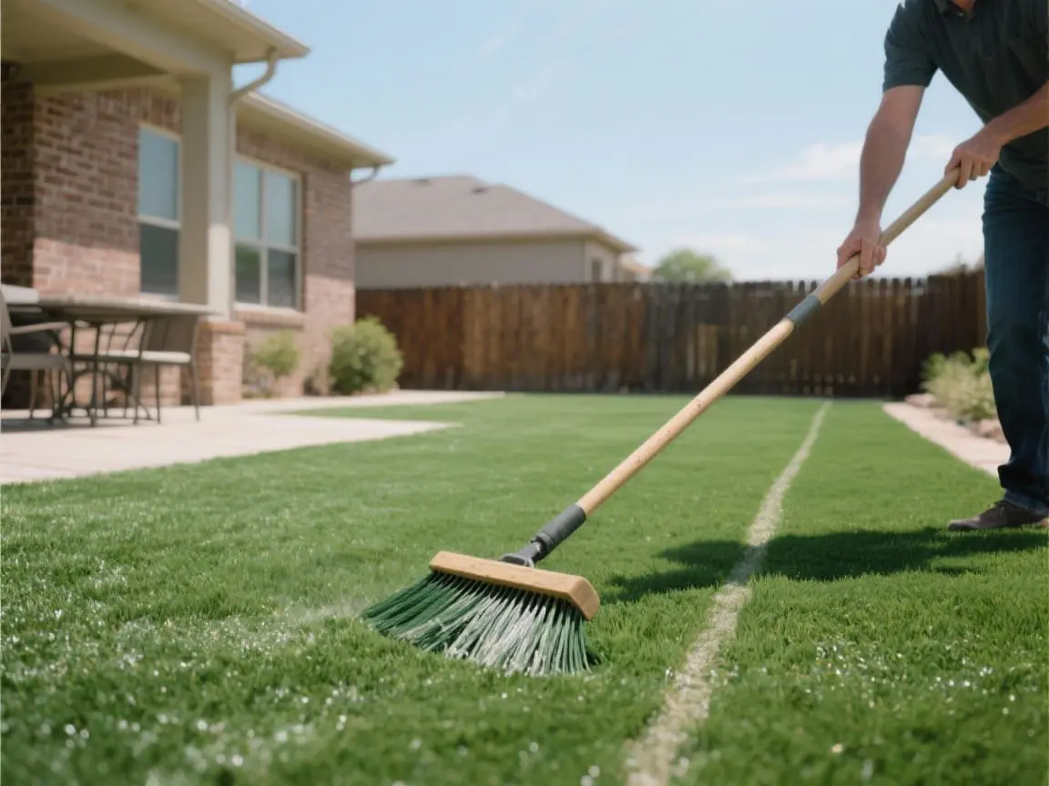 Identify the areas that get the most foot traffic—pathways from the patio door, play areas, or spots where your pets frequently run. Using a stiff, synthetic-bristle broom (not wire), brush against the grain of the turf fibers. This is called “cross-brushing,” and it helps the blades stand back up, preventing them from looking matted down.